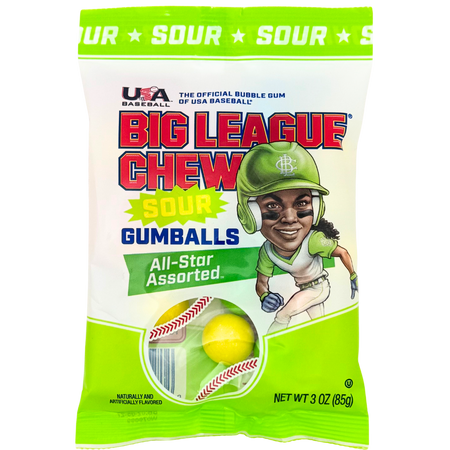 Hit it home with Big League Chew Sour Gumballs! This bubblegum is lusciously soft, extremely chewy and offers a tangy and sour experience!