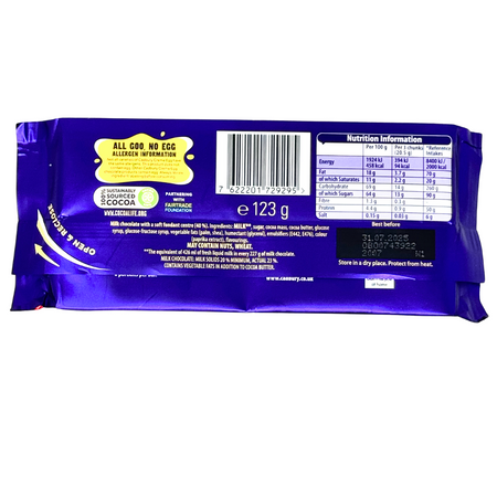 Indulge in the delectable Cadbury Cream Egg Bar (UK) - 123g, featuring a creamy center coated in rich chocolate. Savor every bite of this iconic treat, perfect for satisfying your sweet tooth. Made from the finest ingredients, this bar is sure to please any chocolate lover.