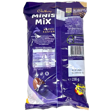 This 238g assortment of Cadbury Minis Mix offers a delicious variety of UK favorites, perfect for satisfying all your chocolate cravings. Get a taste of Cadbury's famous Dairy Milk, Crunchie, Twirl, Wispa, and Fudge bars all in one package. Enjoy the perfect blend of creamy and crunchy textures in every bite.