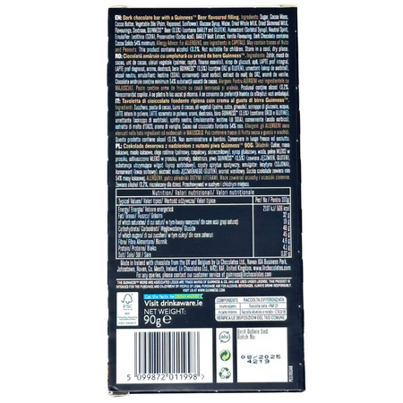 Indulge in the rich and velvety flavors of our Guinness Truffle Chocolate Bar (UK). Made with 90g of decadent chocolate and infused with the iconic taste of Guinness, this treat is perfect for any chocolate lover. Expertly crafted to deliver a smooth and luxurious experience, one bite and you'll taste the world-renowned Irish stout in a whole new way. Elevate your taste buds with our Guinness Truffle Chocolate Bar.