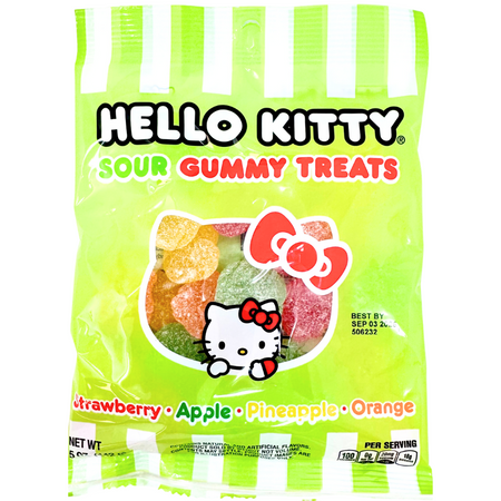 Indulge in the adorable world of Hello Kitty with these Sour Gummi Treats! Each 5oz package contains a mix of delicious gummy candies in the shape of your favorite feline friend. Made with real fruit juice, these treats are both cute and tasty, making them a hit for kids and adults alike.