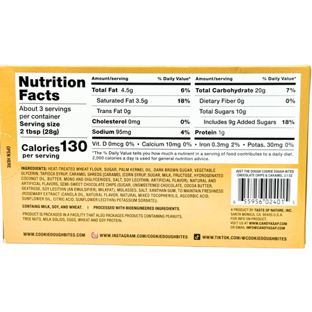 Indulge in the perfect blend of rich chocolate chips and gooey caramel with Just The Dough Cookie Dough Bites. Made with the highest quality ingredients, each 3.1oz pack is packed with deliciousness. Satisfy your cravings with Just The Dough.
