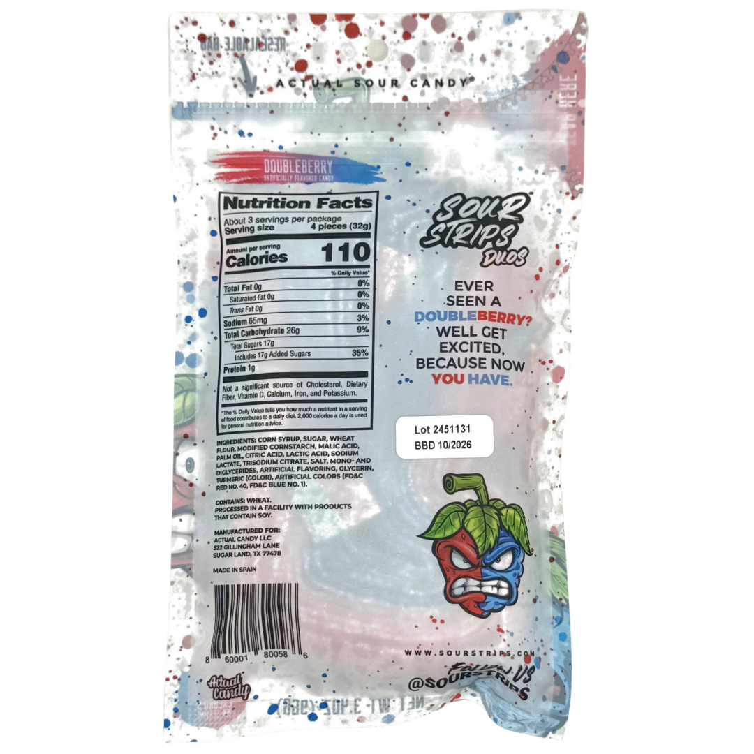 Indulge in a double serving of berry! The Sour Strips Doubleberry offer an insanely sour candy filled with the tangy flavors of raspberry and strawberry!