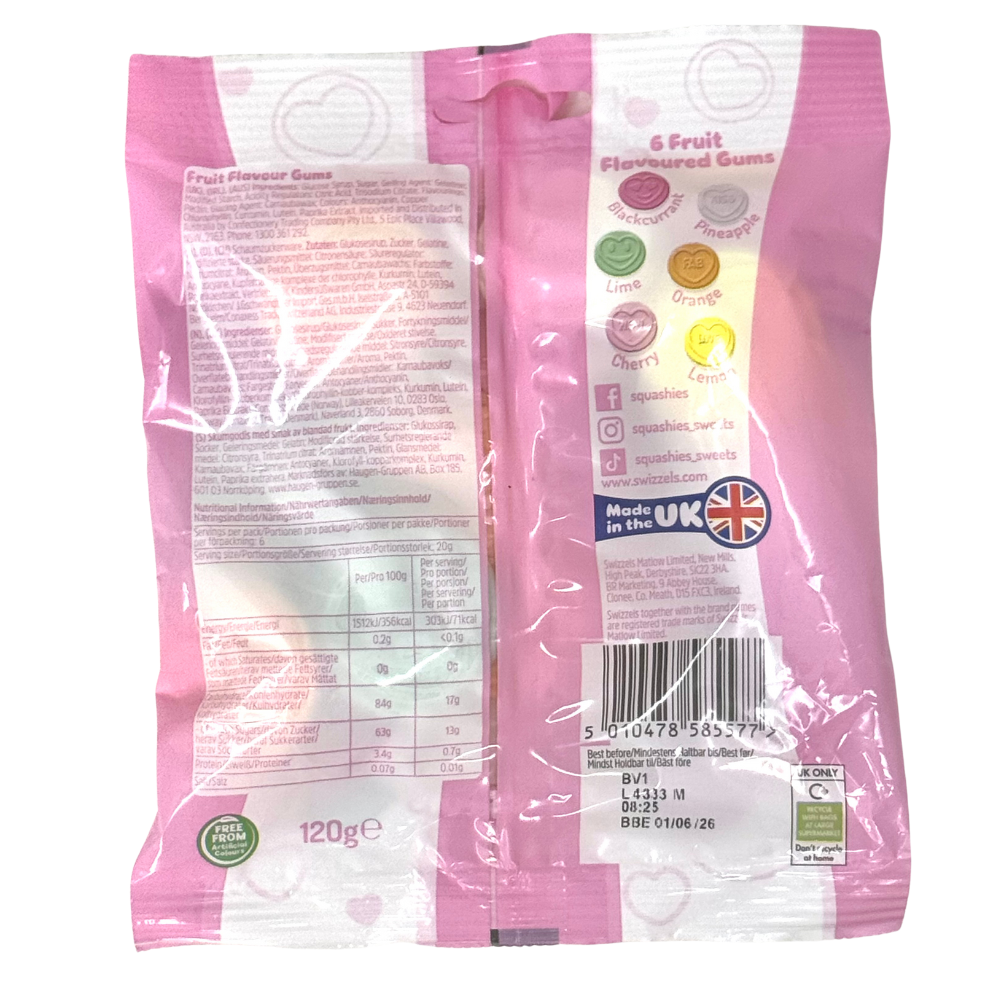 Indulge in a delightful mix of fruity flavors with Swizzels Squashies Love Hearts. These soft and chewy candies are perfect for sharing with loved ones or for satisfying your sweet tooth. With 120g of Love Hearts, you'll have plenty to go around. Bring a little love into your day with Swizzels Squashies.